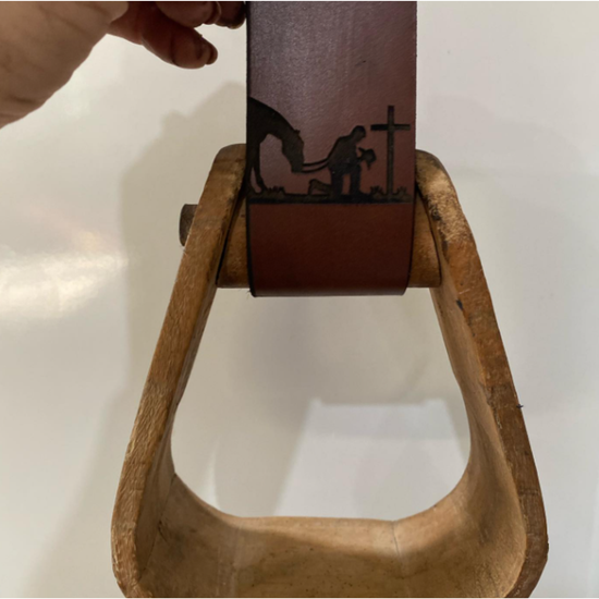 Engraved leather strap attached to the stirrup to use in their farmhouse for a towel holder