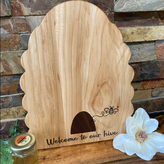 Custom shaped board grey elm board with walnut inlay for a local honey farm.