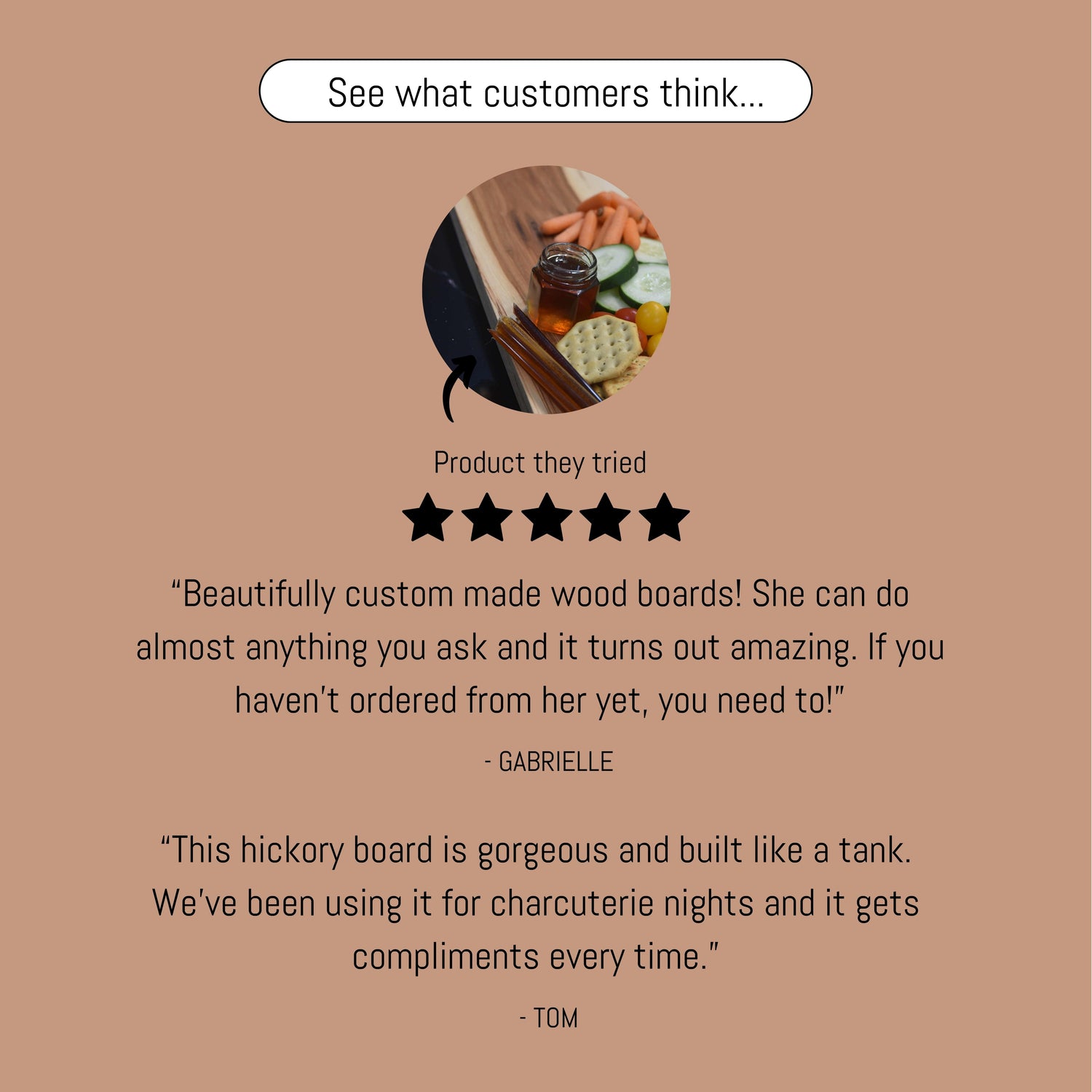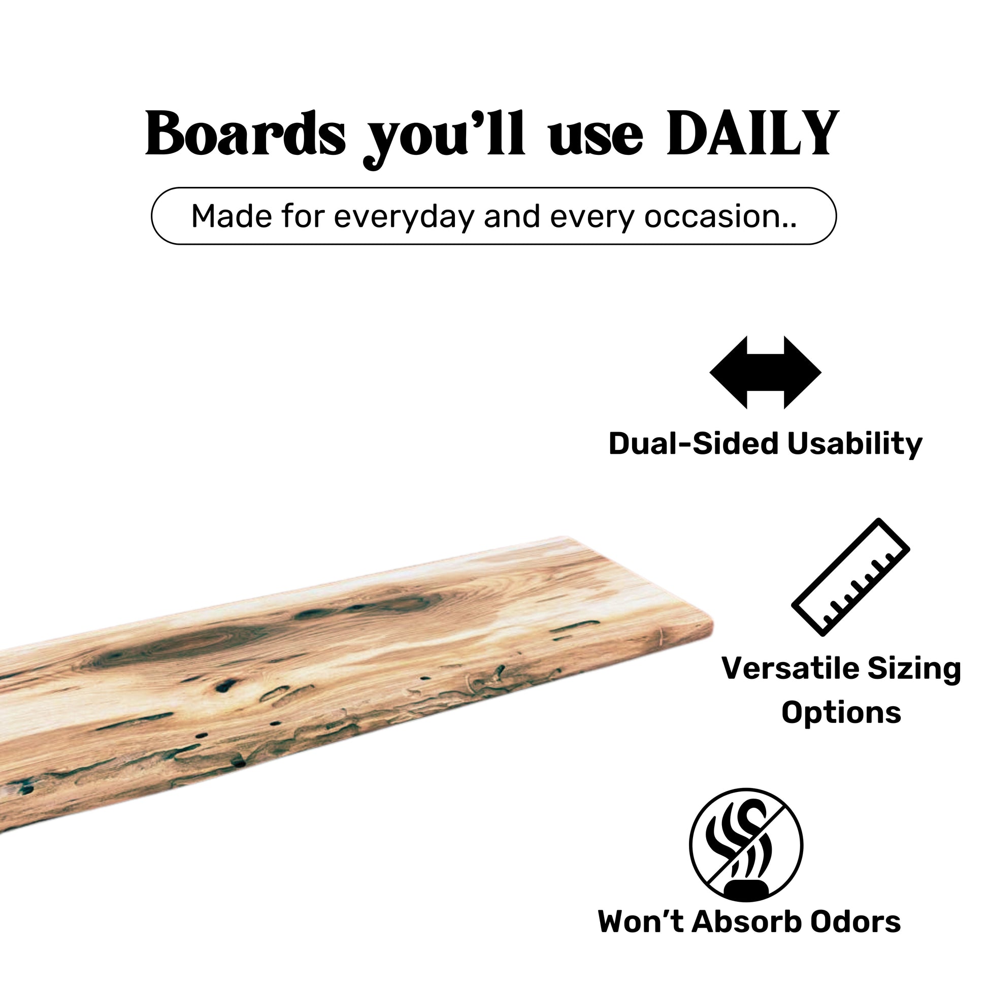Because they start with a story—and not one from a factory. We sustainably harvest the wood ourselves, right from our own woods or from fallen trees on our neighbors’ land. Every board is cut, shaped, and finished by hand in our Ohio workshop, preserving the live edge and all the wild, beautiful character nature gave it—knots, grain, worm trails and all. These aren’t cookie-cutter boards; they’re one-of-a-kind pieces with purpose, personality, and roots (literally).