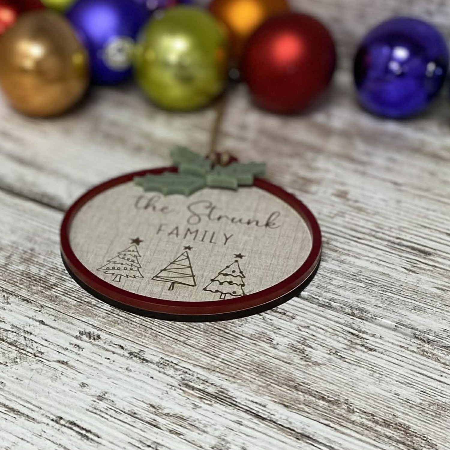This personalized Christmas ornament layers texture, color, and meaning into one beautiful keepsake. The base is a linen-textured wood engraved with your family name and three charming Christmas trees — soft, subtle, and timeless. Framing it is a berry-red acrylic border that adds a bold holiday pop. Finished with three green holly leaves on top, this ornament brings together classic Christmas colors in a modern, polished way. Lightweight, eye-catching, and personal, it’s the perfect addition to your own tree or a heartfelt gift that will be admired year after year.