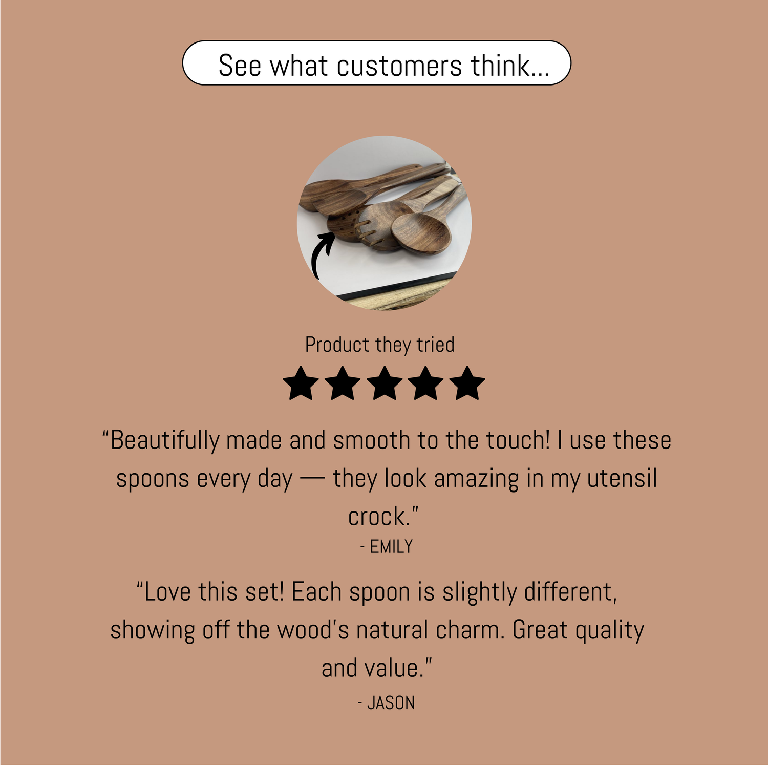 Made from 100% natural, non-toxic hardwood, this spoon set is completely free of plastics, glues, or harsh chemical coatings. It's a safer choice for you and your family—and a better one for the planet. Whether you're stirring hot soups or plating fresh salads, you can cook with confidence knowing your utensils are as clean and conscious as your ingredients.